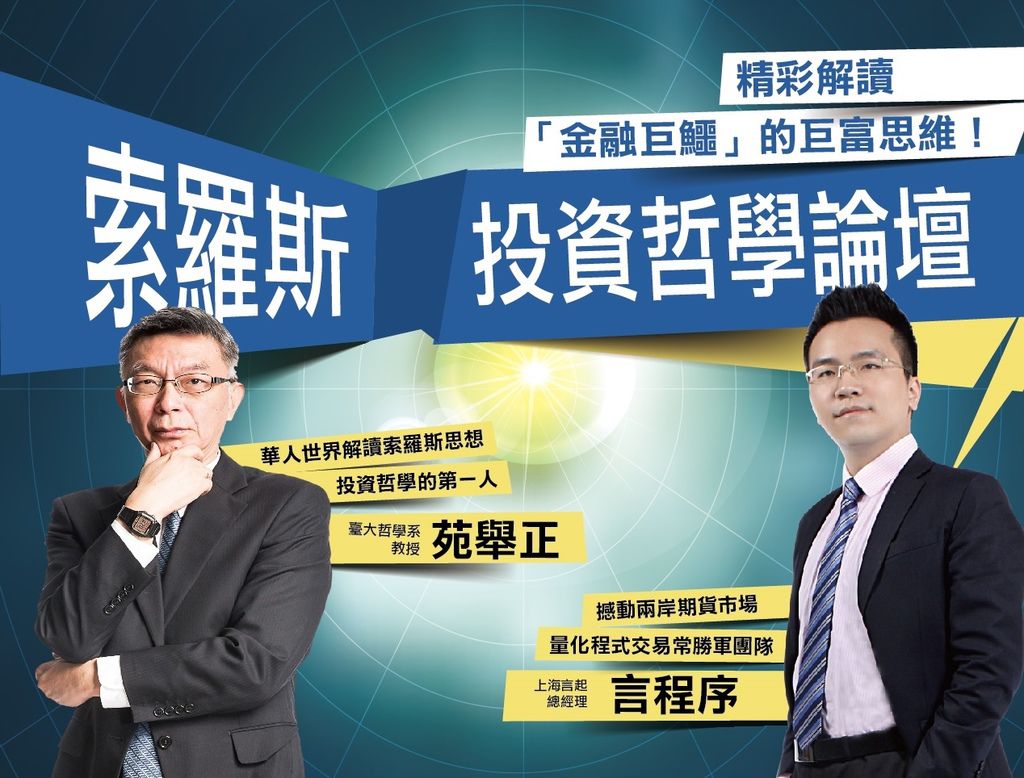 當天除了苑舉正教授針對索羅斯知名戰役進行分析外,言起投資言程序也將分享他們在投資市場的實戰經驗,如何結合巴菲特的價值投資與索羅斯的多空策略,在金融市場上「活著」,並創造出好的投資績效。
