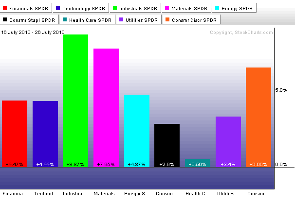 這是近七個交易日的類股個表現,漲最多的工業類股,上漲8.87%。其次是原物料類股上漲7.95%。第三是非必須消費類股上漲6.66%。由景氣循環股領漲。防禦性類股中的健康護理小漲0.56%,公用事業類股漲3.4%。