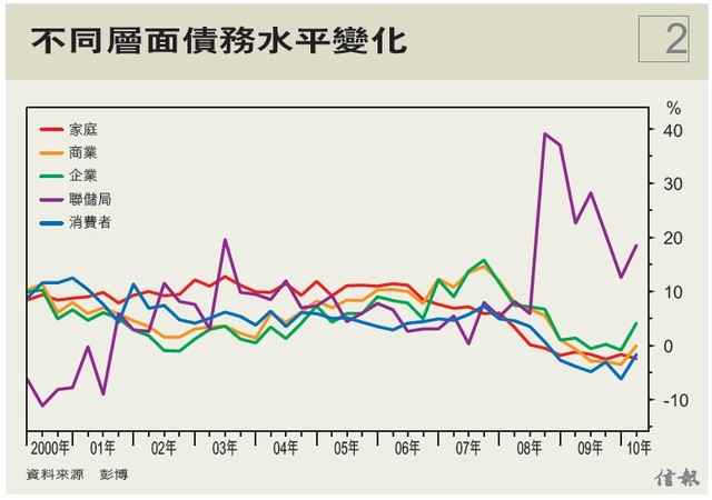 有投資朋友說美國的錢很多,這句話本身並沒有錯。但是FED灑出來的錢有沒有發揮很大的作用,這就有待商榷了。我引用香港信報的資料,讓大家瞭解一下美國目前貨幣的狀況。目前美國正在進行所謂的"去槓桿化",一般投資人使用融資或是期貨都是有槓桿的效果,也就是說你只有五塊錢,去做了十塊、二十塊、五十塊的事情,而去槓桿話就是把錢還回去,讓借的錢慢慢變少。從上圖中可以發現,美國家庭、企業、消費者及商業等都在進行去槓桿化的動作,也就是說借錢的需求並沒有增加。
