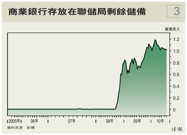 就銀行來講,由於經濟復甦前景不明確,加上借貸需求降低,商業銀行放在FED的準備金還很多,寧可賺取0.25%的利息,也非把錢放到市場上。