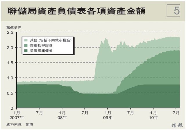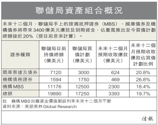 以總額計,未來一年陸續到期的上述三類資產,合共3400億(美元.下同),其中MBS佔2300億、機構債券500億,國庫債券佔去餘下的600億。屈指一算,聯儲局以債券到期後所得現金,分階段購入二至十年期國債,簡單地按月平均攤分,即聯儲局把贖回到期債券得來的本金購入國債,每月價值不足300億;反之,若任由這些債券到期而不作再投資,聯儲局自去年春推行量寬以來所建立的資產組合,便會相應收縮接近二成