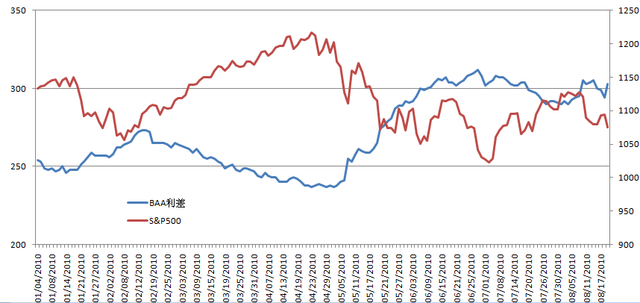 Baa級債券風險溢價(也就是利差)每擴大1個百分點(100基本點)標準普爾500指數就會下挫300點