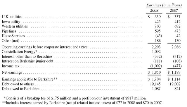 僅僅2008年,中美公司在兩個營運部門花了18億在風力發電上,到今天公司是全國風力發電股份有限公司中最大的。順道一提,可以比較一下18億與在愛荷華州的太平洋企業稅前盈餘11億( 在表中的右邊欄 )。在我們的公用事業裡,我們花掉我們全部賺的,某些是為了滿足我們所服務地區之需求。的確,中美公司自2000年初波克夏入主後便沒有發放股利,這些盈餘反而拿來再投資,發展那些我們客戶所需求與渴望的公用事業系統。在交換上,我們被允許在我們投資的巨大金額中,獲得合理的回報;對大家而言,這是相當棒的夥伴關係。