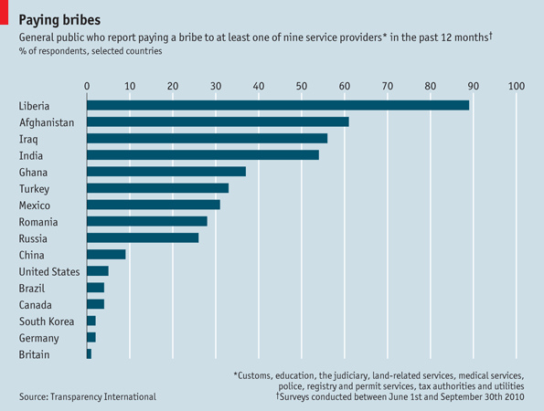 根據最新全球貪腐趨勢指數,約有四分之一的人在過去一年行賄,這份報告主要著重在一般大眾的行賄,包括文化、教育、醫療服務以及司法,而不是針對一般最常見的政治賄賂醜聞,員警是裡面最多收賄的,約有29%的人接觸他們並給予他們一些東西,第二多的則是在進行註冊和發放許可證,稅務當局收受約其顧客的4%所給的賄賂,通常是收入最少的最有可能行賄,在所有國家中,利比利亞可以說是天天都有人在行賄,相較之下巴西是最為乾淨的。
