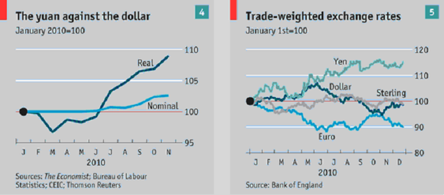 迫於美國的壓力,中國允許人民幣升值;高通膨意味實際升值的更多。日圓的升值威脅到出口導向復甦,促使日本政府持續監控日圓的走勢,歐洲的動盪乃因其主權債務危機正侵蝕歐元的基礎。