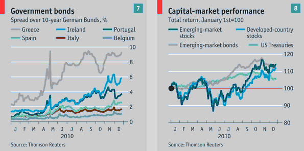 很不幸地,緊縮並未帶來緩和的希望;周邊歐洲政府公債殖利率相較於德國持續上升,債券的美好日子可能結束了,當美國經濟興起以及投資人蜂擁致股票市場時,在2010年大部分時間上漲的的新興市場債和美國公債價格開始步入下跌的情形。