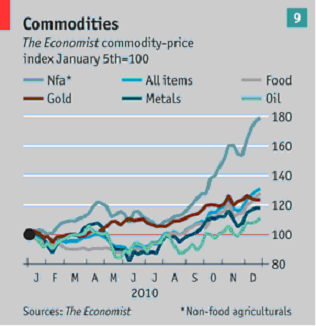 商品市場在股票及債券之外獨領風騷,隨著全球成長下走向多頭,特別是在新興市場;對於通膨避險得需求可能導致空頭(bears cite a desire for inflation hedges,2011的市場將會在這樣的張力下進行。