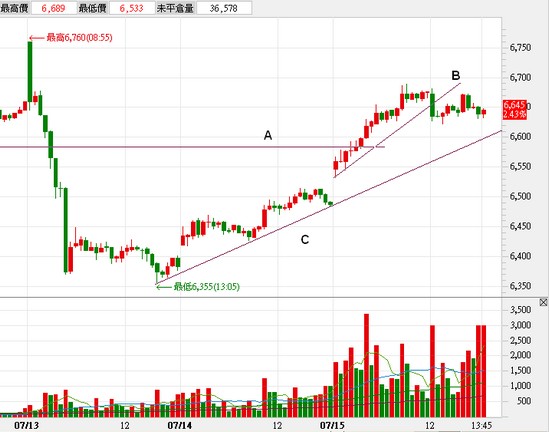 結果如上圖所示,C線是前日畫的,而台股以跳空開高的走勢,改變了短期的上升趨勢(B線)。