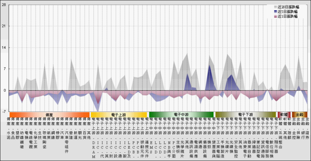 跌深:IC設計、IC製造、顯示器、紡織纖維等。