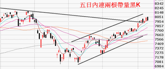 技術上,又是個七十幾點的中黑K棒,五天內又來一次開盤開最高,收盤幾乎收最低的走勢。