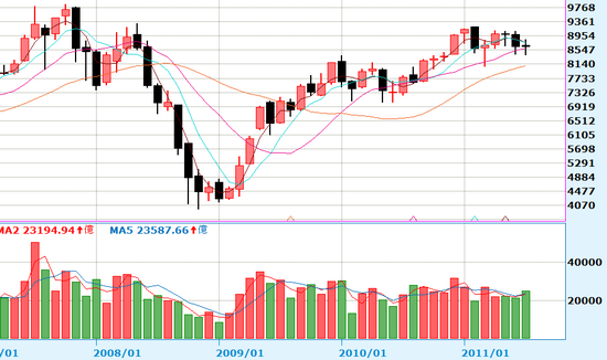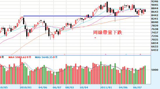 依舊是盤整格局,周線紅黑K相間,月線收十字。