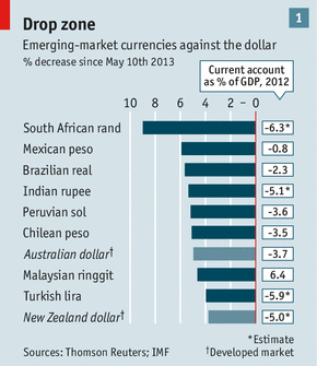那些依賴國外資本來平衡收支的國家最易受到影響。南非的經常項目赤字占GDP的比重較大,因此蘭特跌得比較慘。蘭特的表現還受到疲軟的大宗商品價格的傷害,部分由於中國經濟增速放緩。其他許多國家,從新興國家智利和巴西到發達國家澳大利亞,他們都處於這樣的虛弱狀態:有大宗商品資源稟賦,較大的經常項目赤字和疲軟的貨幣。