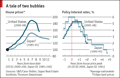 美國會步上1990時期日本停滯性通膨的後塵嗎? Aug. 21st, 2008 From The Economics print edition 由於現在美國經濟受到房價大幅下滑及信用緊縮的影響,有些人開始擔心美國是否會像1990年代的日本一樣,在經濟泡沫後經歷了十年之久的停滯性通膨。當時日本的資產泡沫化情況跟現在美國面臨的情況很像:除了通膨的影響外,最主要的就是資產價值的影響。許多人都會假設資產的價格不可能是全國性的下滑,因此一旦資產價格開始全國性的下跌時,貸方便開始付不出房貸,而銀行便開始削減借款。這也是為什麼日本在近十年來的平均經濟成長都低於1%。 一、資產價格/ 房價(見下圖左):美國房市情況不會比當時日本房市情況樂觀。 美國在2000到2006年間全國房價上漲了90%,在房價觸頂後目前已經下滑了20%,但許多專家認為近期會再下滑10%或更多。日本在1985到1991年間全國房價上漲了51%,但房價上漲幅度較大的則主要集中在大城市(全國性的房價上漲對於經濟的衝擊較大)。在房價觸頂後下滑了40%後穩定。 二、商品價格(Price of commercial property) 在同樣期間內,美國平均物價上漲90%,而當時日本則上漲80%。此外,日本在經歷資產泡沫化的前一年正面臨股市泡沫化,雖然股市泡沫化對日本銀行衝擊很大,但對於老百姓所造成的影響較小,畢竟當時只有30%的人民持有股票。相對之下,美國有超過一半的人口持有股票,因此一旦股市出現危機,對人民所造成的衝擊也會比當年日本情況嚴重。 三、政府因應政策:相同之處是美國及日本都即時調降利率及採取擴張性財務政策。 調降利率方面,日本在房價開始出現下滑不久後便開始調降利率:在1991到1993間重貼現率由6%調降至1.75%(見上圖右)。美國在房價下滑後的兩年間,利率由5.25%下降至2%。 財務政策方面,美國與當時日本採取擴張性財務政策的結果皆使得GDP成長。(日本在1992-1993間GDP成長1.8%,與美國今年年GDP成長率相近。)