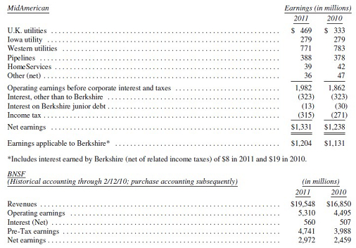 這兩家公司的共同點就是,要將資金投入在建設生命週期長,且受政府監管的資產。其中部分資金,是來自波克夏擔保的钜額長期債務。我們不需要擔保這兩家公司。這兩家事業,在嚴酷的商業環境中,能有很強的獲利能力,並且能夠支應利息需求。在2011疲弱的一年,BNSF的利息保障倍數為9.5倍。同時,在中美能源,有兩項關鍵指標確保其有能力,在任何的狀況下,皆能完全償付債務。穩定的獲利能力,來自獨家提供的服務和多元的獲利來源,使其免於受任何單一監管機構的行動影響。